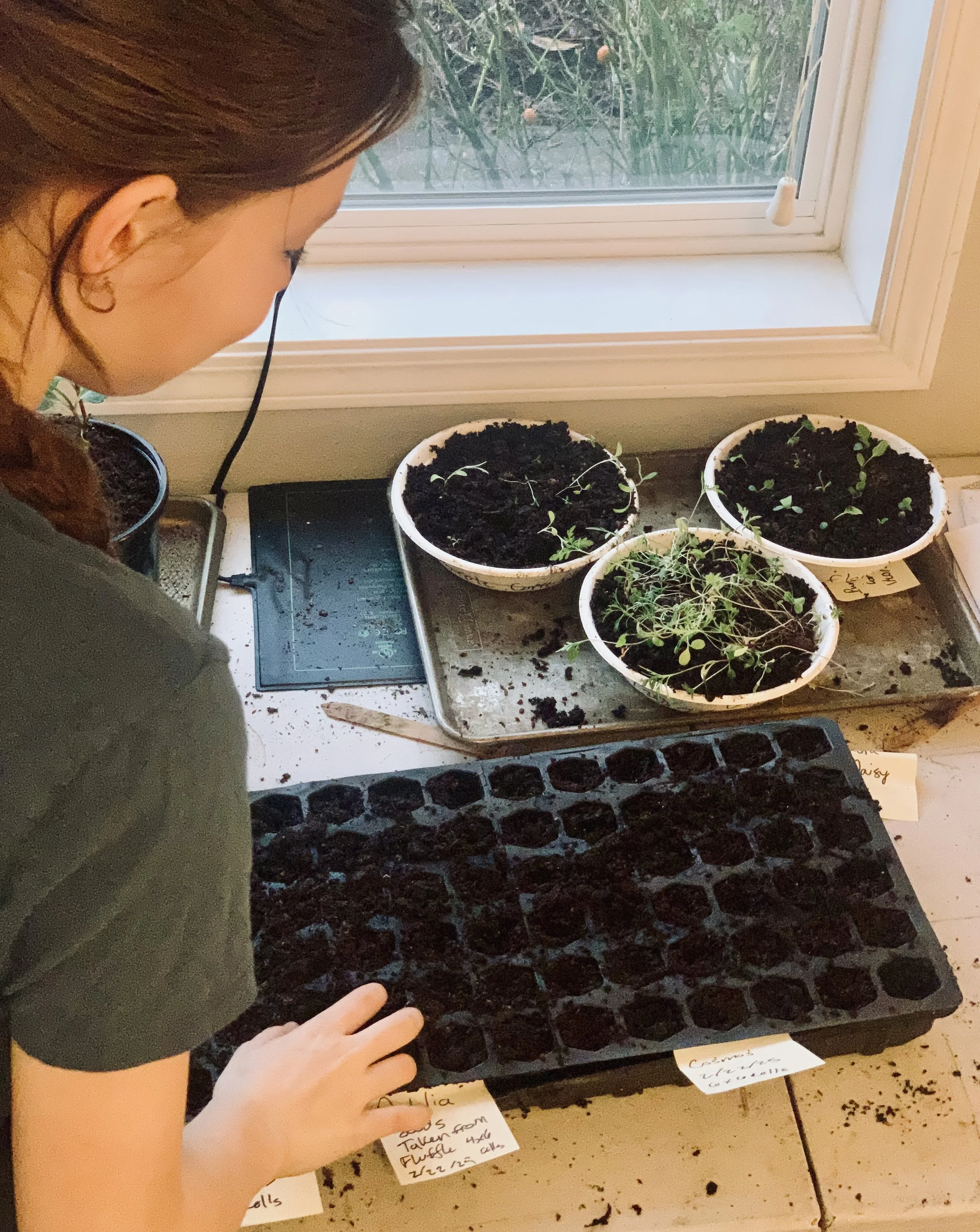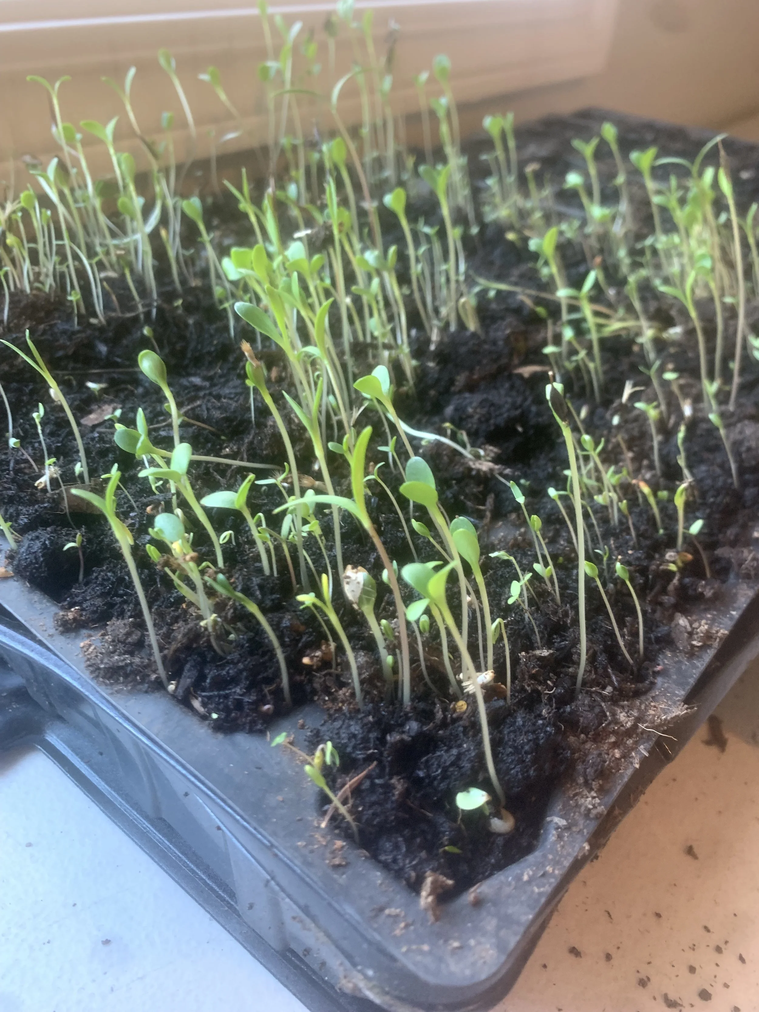 After your seeds are planted there are somethings that are needed to continue their growth. Plenty of light is absolutely necessary! Although window light is great, it is not enough to support a seedling’s needs. They will grow to be thin and not strong, which ruins their chances as cut flowers. In their earliest stages I use an overhanging dome light to provide the extra lighting. If you do not want to buy a dome light, a desk lamp will work too. It is also super important that your seeds stay warm. When I first plant the seedlings, and its still pretty cold outside, I to lay a heat mat underneath my seedling to provide them with a warm damp atmosphere. If you live in warmer areas where it stays about anywhere from 60-70˚F in late winter and early spring, then heating might not be necessary. Just make sure the seeds stay around 65˚F and watch out for cold nights. You can also use a small space heater or place seed starts close to your house’s heater. The one reason I would suggest a heat mat is it is remarkably easy to overheat the seedlings when using a space heater. A heat mat regulates the heating to around 75˚F so the seedlings don’t get too toasty. When using a heater try to place it in a larger area where there is more space for the heat to go and the ventilation, so the seedlings are not blasted.