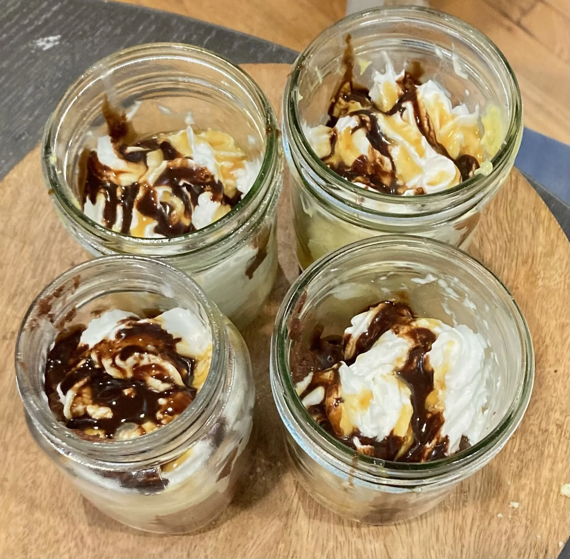 Pull the pudding out of the fridge divide it between all the glasses, pouring a nice layer over the ice cream.